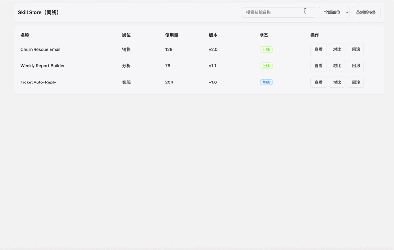 ● Skill Store(技能商店):专家的一次优秀操作路径,可以沉淀为一个“技能”,供整个组织复用。Skill Store具备完整的版本治理能力:技能录制→提炼→上架,支持复用输入变量;变更点可视化呈现,支持一键回滚,避免错误扩散。这形成了 “数据飞轮”——越用越聪明,越用资产越厚。未来,企业还可以根据自身业务场景定制技能,让AI持续进化,适配复杂需求。