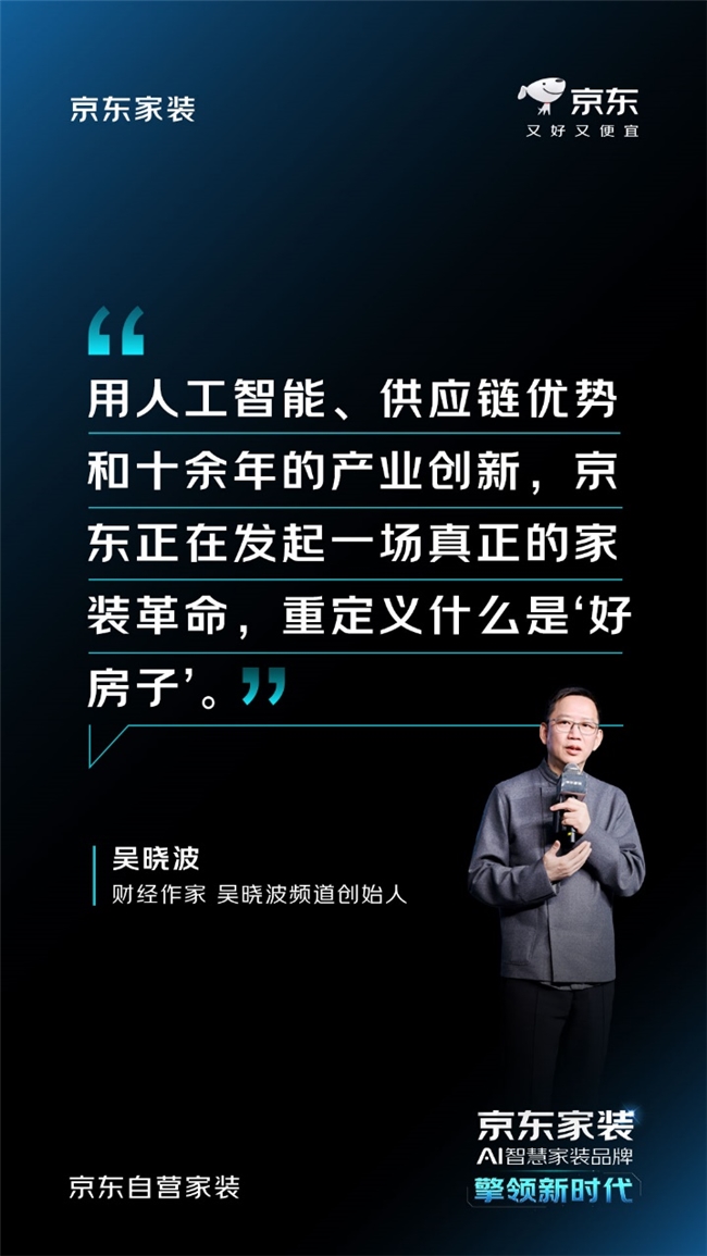 当天,京东全新发布了AI智慧家装品牌——京东家装,将依托AI及超级供应链能力驱动家装行业智能化与标准化升级,为消费者提供一站式整家科技住宅解决方案。吴晓波作为特邀嘉宾,在发布会现场表示,家装行业之所以“难啃”,核心在于供需两端的突出矛盾。京东家装以AI技术啃下家装这块“硬骨头”,依托平台与供应链优势打造出一体化智慧家装服务,是真正让技术回归人的需求。