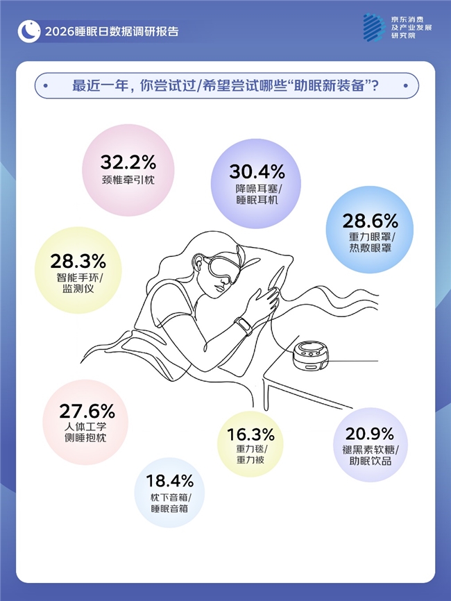 大家对睡个好觉的需求关注,不仅仅只聚焦在“声音”。调研显示,在颇受这届年轻人欢迎的睡眠新装备中,除了睡眠耳机、睡眠音响等声音管理类产品,通过睡姿矫正、身心舒缓提升睡眠质量的相关产品也备受追捧。其中,颈椎牵引枕以 32.2% 的投票率当选最受欢迎的睡眠新装备,助眼部头部放松的重力眼罩、热敷眼罩(28.6%)、智能手表等睡眠监测设备(28.3%)、符合人体工学的侧睡超长抱枕(27.6%)、助眠软糖或饮品(20.9%)以及重力毯(16.3%)等创新助眠产品,也正被越来越多人尝试。