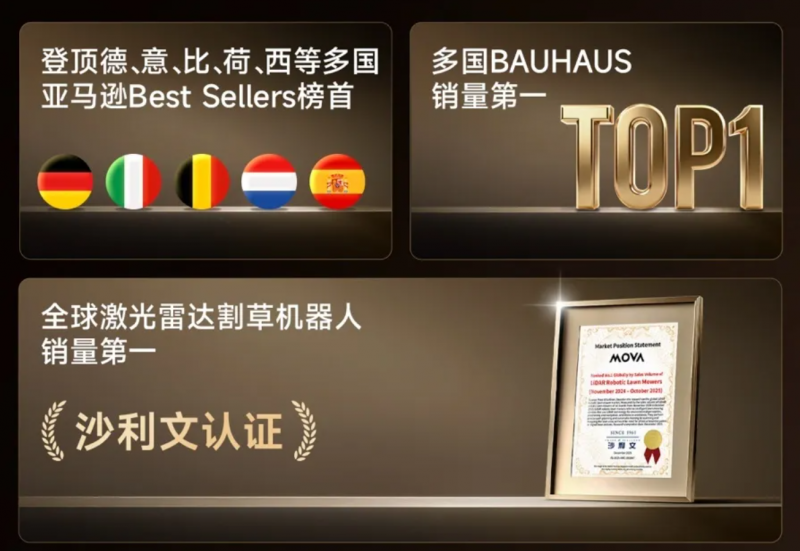 从双目视觉AI技术、UltraView“环境感知系统,到星地一体技术,MOVA正以全方位技术创新,打通割草机器人自主决策“最后一公里”,引领全球庭院养护智能化变革。同样,硬核的技术实力正在快速转化为市场竞争力,截至2026年3月,MOVA不仅销量指数级增长,登顶亚马逊比利时、荷兰、西班牙等多国Best Sellers榜首,更在德国、意大利等国家市场占有率超30%,成为全球消费者智能割草机器人首选品牌。