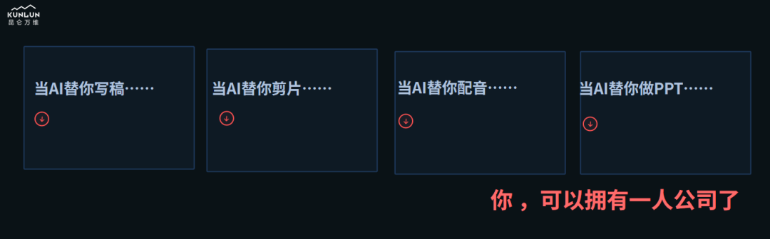 昆仑万维作为一家以AIGC为核心的公司,致力于从创造到变现,为所有MCN机构、所有个人创作者提供一揽子解决方案。我们相信,全球一人公司——尤其是在内容创作赛道——将是一个非常庞大的市场。就像网络小说把传统作家从一万人变成了五百万人一样,整个内容创作领域会迎来上百倍的膨胀。