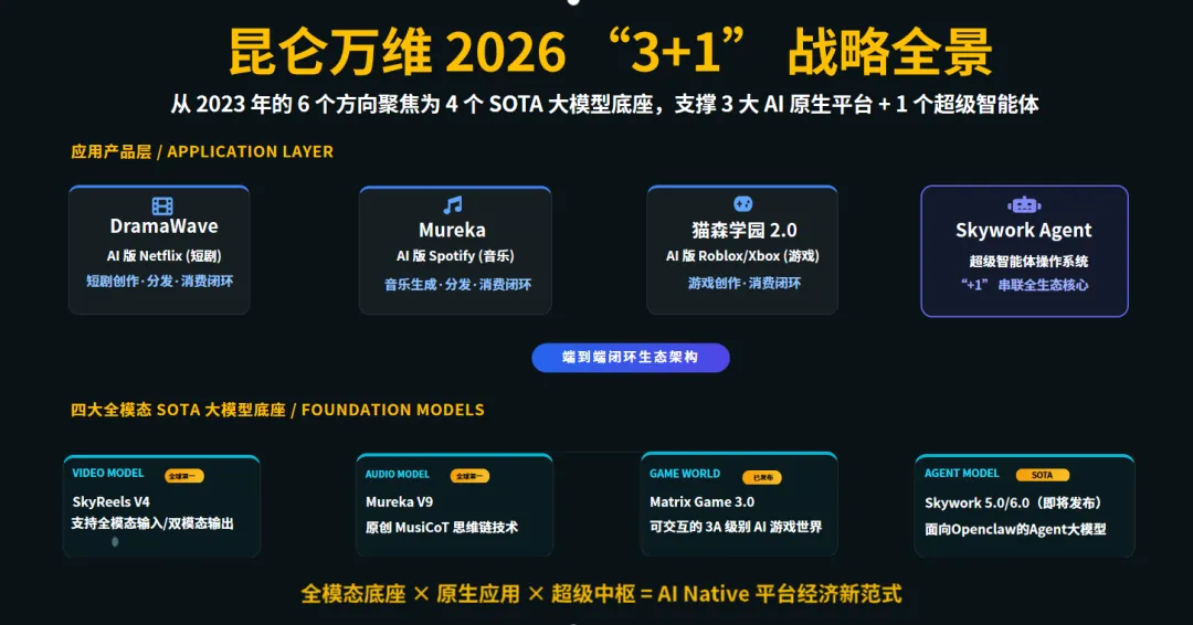 我们目前拥有海外用户量最大的短剧平台DramaWave,有中国最好的音乐大模型Mureka,有游戏平台以及Skywork Agent,背后是我们四大全模态SOTA大模型的支撑。未来我们将打造 AI Native 平台经济新范式、赋能超级个体。