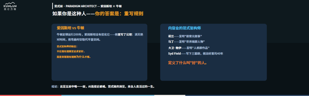 严格而言,我认为人类到现在为止能够称为范式层架构师,公认的只有牛顿和爱因斯坦。如果再扩大范围,Transformer论文的七位作者、OpenAI的早期CTO,也算得上。这类人,目前AI几乎没有希望能替代他们。不仅无法代替,AI还可能极大加速这类人实现结果的速度。