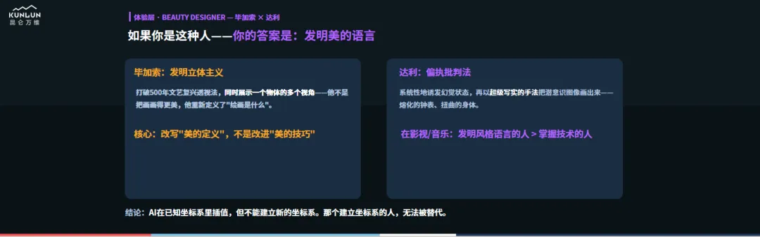 AI可以轻松做出各种风格的美的东西,但本质上是一个“缝合怪”。让AI去发明一个它从未见过的美的风格——坦白讲,AI目前做不到。