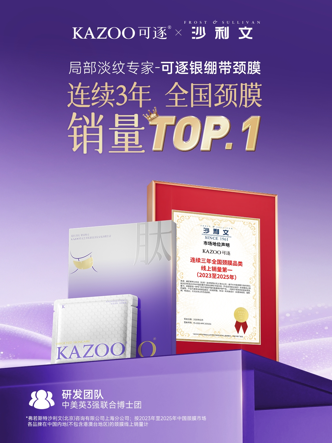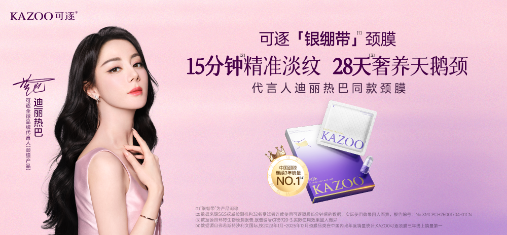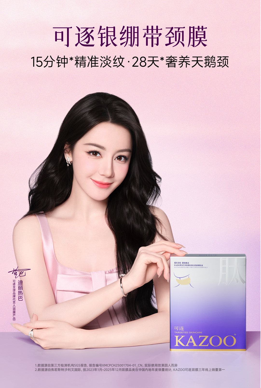 KAZOO可逐依托院线级科研标准,精准攻克局部抗衰难题,用科研实力守护30+女性的从容美态。其明星产品银绷带颈膜,荣获沙利文权威认证的连续三年全国颈膜品类线上销量第一(2023至2025年),成为国货局部精准抗老标杆。迪丽热巴以扎实演技深耕角色,不逐流量只炼实力,优雅沉稳的气质与可逐专业抗衰、匠心筑品的品牌调性完美适配。