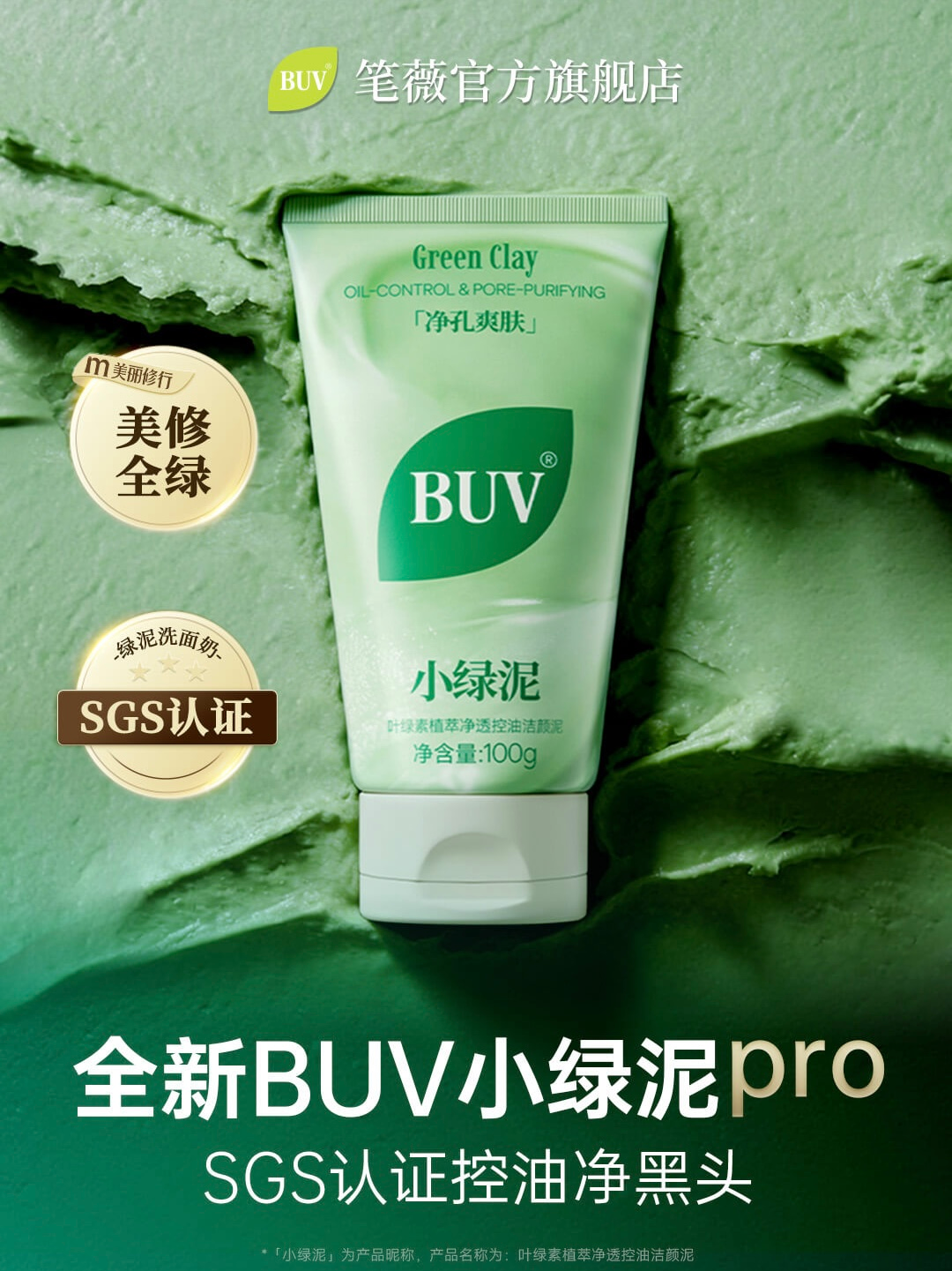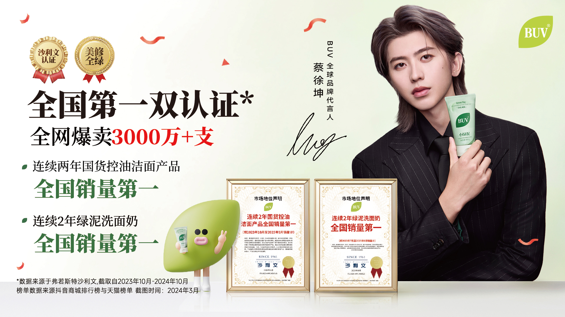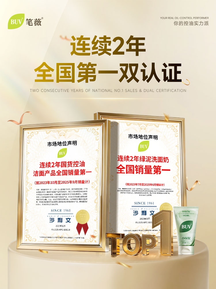 BUV扎根油皮专研赛道,聚焦油皮出油、黑头毛孔等核心痛点,凭借超分子SVP精研等专利技术,打造清爽、长效、温和的油皮护理方案,靠实打实的功效站稳细分市场。其明星单品“小绿泥洗面奶”连续两年拿下沙利文认证的“国货控油洁面全国销量第一”,成为无数油皮用户的“控油首选”。