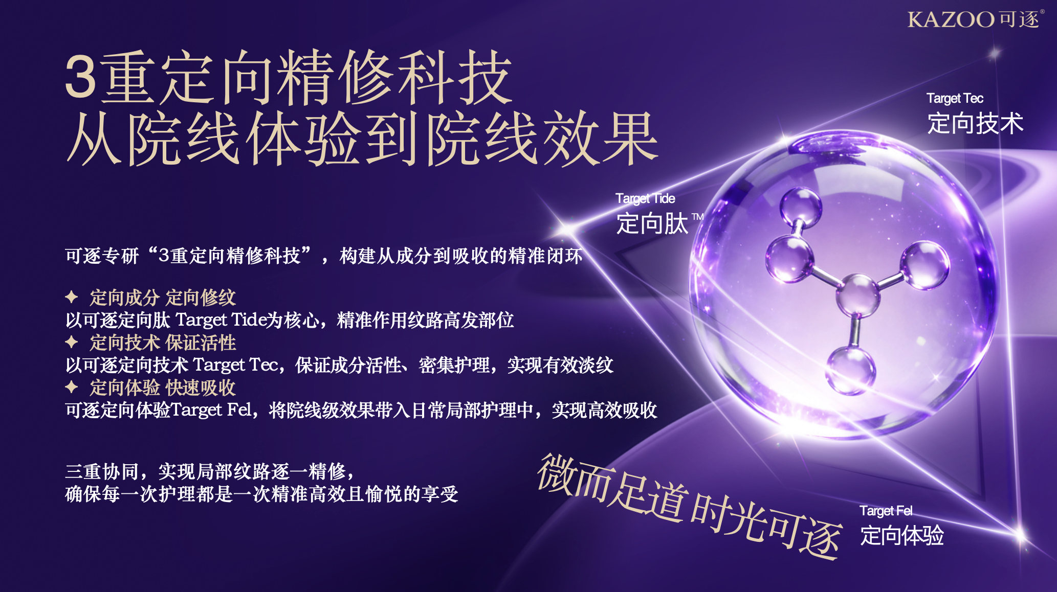 支撑这一专业级颈部护理体验的,正是KAZOO可逐独特的三重定向精修科技,通过定向肽、定向技术、定向体验的组合,实现了靶向淡化颈纹、紧致提升颈部轮廓、改善暗沉松弛的全方位颈部抗衰效果。第三方权威人体功效测试证明:连续使用产品28天,颈纹数量减少38.73%,静态纹深度减浅31%,动态纹可见度下降37%。