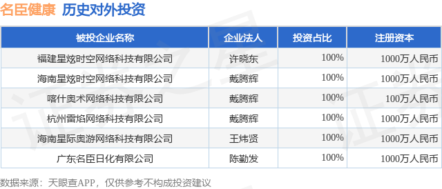 证券之星消息,根据天眼查APP显示,名臣健康(002919.SZ)新增一起对外投资事件,被投资公司为福建星炫时空网络科技有限公司,法定代表人许晓东,投资占比为100%。该公司从事软件和信息技术服务业,注册资本为1000万人民币。目前,名臣健康共存在对外投资6项,详见下表: