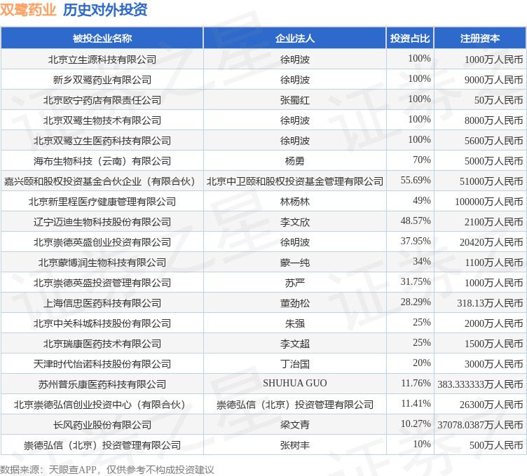 证券之星消息,根据天眼查APP显示,双鹭药业(002038.SZ)新增一起对外投资事件,被投资公司为北京立生源科技有限公司,法定代表人徐明波,投资占比为100%。该公司从事软件和信息技术服务业,注册资本为1000万人民币。目前,双鹭药业共存在对外投资24项,投资占比前20的项目见下表: