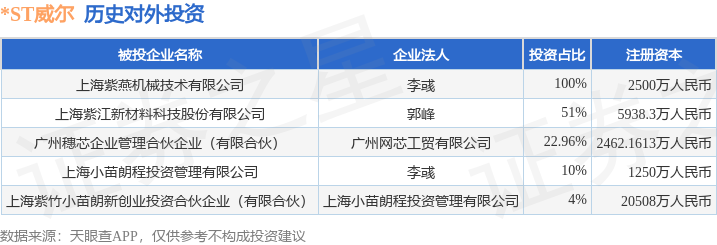 证券之星消息,根据天眼查APP显示,*ST威尔(002058.SZ)新增一起对外投资事件,被投资公司为上海紫江新材料科技股份有限公司,法定代表人郭峰,投资占比为51%。该公司从事橡胶和塑料制品业,注册资本为5938.3万人民币。目前,*ST威尔共存在对外投资5项,详见下表: