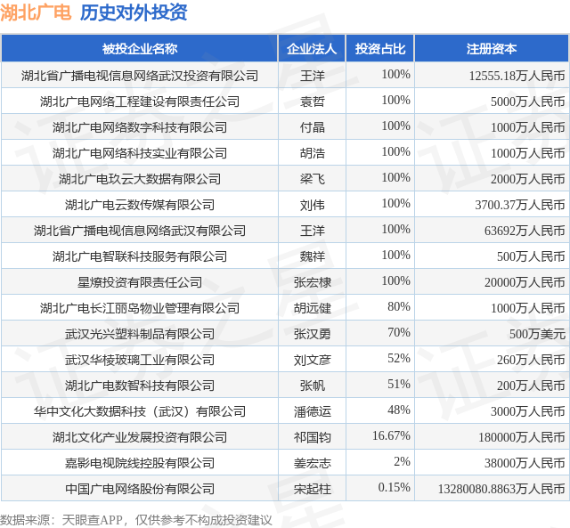 证券之星消息,根据天眼查APP显示,湖北广电(000665.SZ)新增一起对外投资事件,被投资公司为湖北广电数智科技有限公司,法定代表人张帆,投资占比为51%。该公司从事软件和信息技术服务业,注册资本为200万人民币。目前,湖北广电共存在对外投资17项,详见下表:
