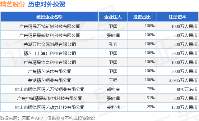 证券之星消息,根据天眼查APP显示,精艺股份(002295.SZ)新增一起对外投资事件,被投资公司为广东精晟万希新材科技有限公司,法定代表人卫国,投资占比为100%。该公司从事软件和信息技术服务业,注册资本为1000万人民币。目前,精艺股份共存在对外投资10项,详见下表: