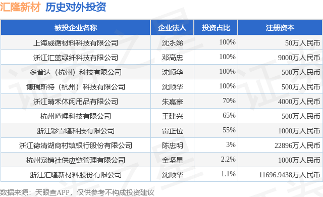 证券之星消息,根据天眼查APP显示,汇隆新材(301057.SZ)新增一起对外投资事件,被投资公司为杭州喳哩科技有限公司,法定代表人王建兴,投资占比为65%。该公司从事纺织服装、服饰业,注册资本为500万人民币。目前,汇隆新材共存在对外投资10项,详见下表: