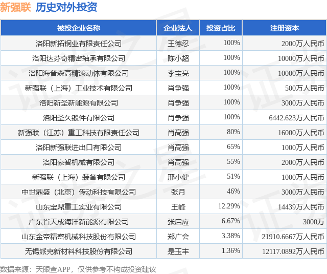 证券之星消息,根据天眼查APP显示,新强联(300850.SZ)新增一起对外投资事件,被投资公司为中世鼎盛(北京)传动科技有限公司,法定代表人张月,投资占比为46%。该公司从事通用设备制造业,注册资本为3000万人民币。目前,新强联共存在对外投资15项,详见下表: