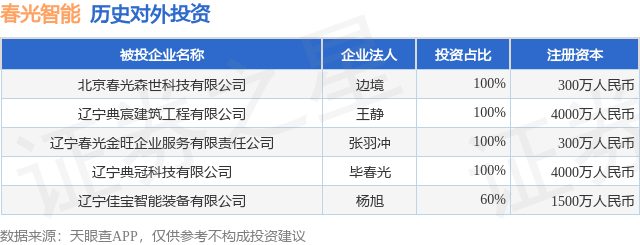 证券之星消息,根据天眼查APP显示,春光智能(920810.BJ)新增一起对外投资事件,被投资公司为北京春光森世科技有限公司,法定代表人边境,投资占比为100%。该公司从事批发业,注册资本为300万人民币。目前,春光智能共存在对外投资5项,详见下表: