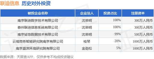 证券之星消息,根据天眼查APP显示,联迪信息(920790.BJ)新增一起对外投资事件,被投资公司为南京联迪数字技术有限公司,法定代表人沈荣明,投资占比为100%。该公司从事软件和信息技术服务业,注册资本为300万人民币。目前,联迪信息共存在对外投资5项,详见下表: