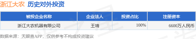 证券之星消息,根据天眼查APP显示,浙江大农(920855.BJ)新增一起对外投资事件,被投资公司为浙江大农机器有限公司,法定代表人王靖,投资占比为100%。该公司从事通用设备制造业,注册资本为6600万人民币。目前,浙江大农共存在对外投资1项,详见下表: