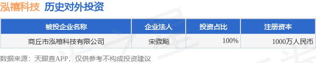 证券之星消息,根据天眼查APP显示,泓禧科技(920857.BJ)新增一起对外投资事件,被投资公司为商丘市泓禧科技有限公司,法定代表人宋骤飚,投资占比为100%。该公司从事软件和信息技术服务业,注册资本为1000万人民币。目前,泓禧科技共存在对外投资1项,详见下表: