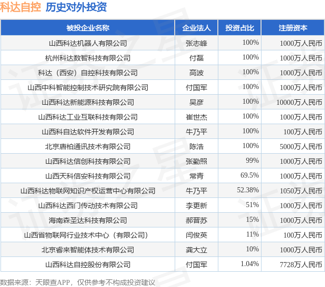 证券之星消息,根据天眼查APP显示,科达自控(920932.BJ)新增一起对外投资事件,被投资公司为山西科达机器人有限公司,法定代表人张志峰,投资占比为100%。该公司从事计算机、通信和其他电子设备制造业,注册资本为1000万人民币。目前,科达自控共存在对外投资16项,详见下表: