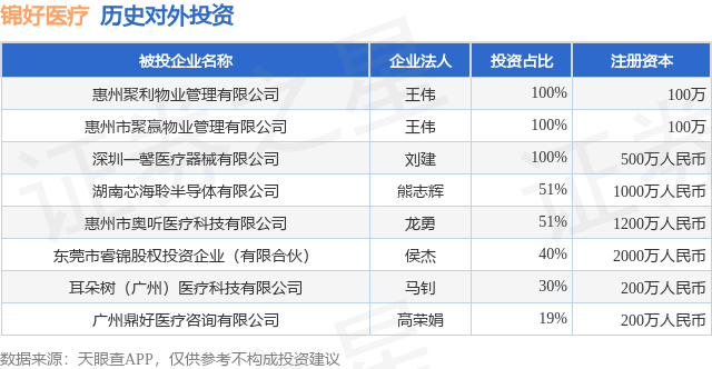 证券之星消息,根据天眼查APP显示,锦好医疗(920925.BJ)新增一起对外投资事件,被投资公司为惠州聚利物业管理有限公司,法定代表人王伟,投资占比为100%。该公司从事房地产业,注册资本为100万。目前,锦好医疗共存在对外投资8项,详见下表:
