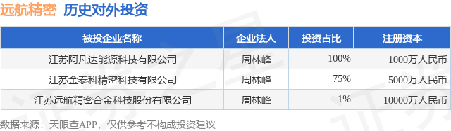 证券之星消息,根据天眼查APP显示,远航精密(920914.BJ)新增一起对外投资事件,被投资公司为江苏阿凡达能源科技有限公司,法定代表人周林峰,投资占比为100%。该公司从事研究和试验发展,注册资本为1000万人民币。目前,远航精密共存在对外投资3项,详见下表: