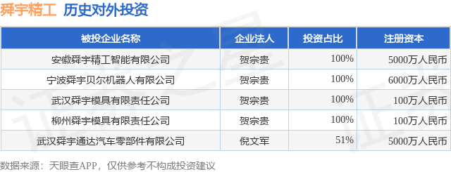 证券之星消息,根据天眼查APP显示,舜宇精工(920906.BJ)新增一起对外投资事件,被投资公司为安徽舜宇精工智能有限公司,法定代表人贺宗贵,投资占比为100%。该公司从事橡胶和塑料制品业,注册资本为5000万人民币。目前,舜宇精工共存在对外投资5项,详见下表: