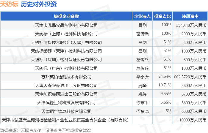 证券之星消息,根据天眼查APP显示,天纺标(920753.BJ)新增一起对外投资事件,被投资公司为天津市乳品食品监测中心有限公司,法定代表人吕刚,投资占比为100%。该公司从事专业技术服务业,注册资本为3540.48万人民币。目前,天纺标共存在对外投资12项,详见下表: