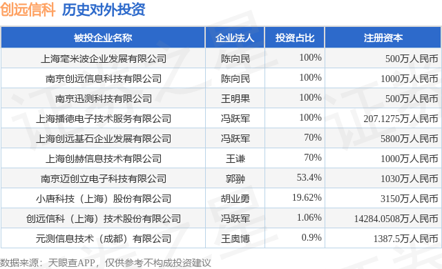 证券之星消息,根据天眼查APP显示,创远信科(920961.BJ)新增一起对外投资事件,被投资公司为上海毫米波企业发展有限公司,法定代表人陈向民,投资占比为100%。该公司从事专业技术服务业,注册资本为500万人民币。目前,创远信科共存在对外投资10项,详见下表: