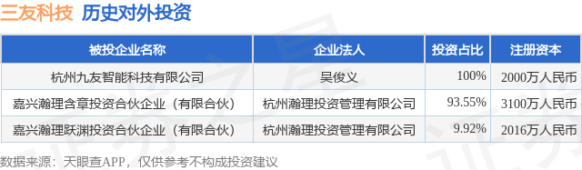 证券之星消息,根据天眼查APP显示,三友科技(920475.BJ)新增一起对外投资事件,被投资公司为杭州九友智能科技有限公司,法定代表人吴俊义,投资占比为100%。该公司从事住宿业,注册资本为2000万人民币。目前,三友科技共存在对外投资3项,详见下表: