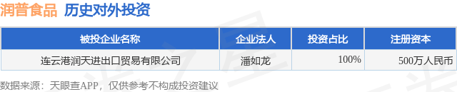 证券之星消息,根据天眼查APP显示,润普食品(920422.BJ)新增一起对外投资事件,被投资公司为连云港润天进出口贸易有限公司,法定代表人潘如龙,投资占比为100%。该公司从事商务服务业,注册资本为500万人民币。目前,润普食品共存在对外投资1项,详见下表: