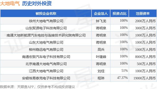 证券之星消息,根据天眼查APP显示,大地电气(920436.BJ)新增一起对外投资事件,被投资公司为徐州大地电气有限公司,法定代表人钟飞龙,投资占比为100%。该公司从事批发业,注册资本为2000万人民币。目前,大地电气共存在对外投资9项,详见下表:
