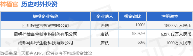 证券之星消息,根据天眼查APP显示,梓橦宫(920566.BJ)新增一起对外投资事件,被投资公司为四川梓橦宫投资有限公司,法定代表人唐铣,投资占比为100%。该公司从事商务服务业,注册资本为18000万人民币。目前,梓橦宫共存在对外投资3项,详见下表: