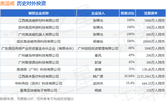 证券之星消息,根据天眼查APP显示,奥迪威(920491.BJ)新增一起对外投资事件,被投资公司为江西奥迪威新材料有限公司,法定代表人张曙光,投资占比为100%。该公司从事计算机、通信和其他电子设备制造业,注册资本为5000万人民币。目前,奥迪威共存在对外投资11项,详见下表: