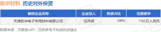 证券之星消息,根据天眼查APP显示,凯华材料(920526.BJ)新增一起对外投资事件,被投资公司为天津凯华电子专用材料有限公司,法定代表人任开阔,投资占比为100%。该公司从事计算机、通信和其他电子设备制造业,注册资本为7765万人民币。目前,凯华材料共存在对外投资1项,详见下表: