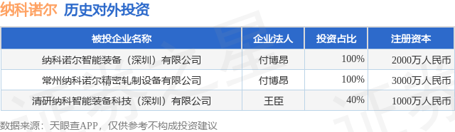 证券之星消息,根据天眼查APP显示,纳科诺尔(920522.BJ)新增一起对外投资事件,被投资公司为纳科诺尔智能装备(深圳)有限公司,法定代表人付博昂,投资占比为100%。该公司从事专业技术服务业,注册资本为2000万人民币。目前,纳科诺尔共存在对外投资3项,详见下表: