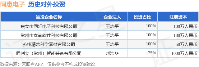 证券之星消息,根据天眼查APP显示,同惠电子(920509.BJ)新增一起对外投资事件,被投资公司为东莞市同轩电子科技有限公司,法定代表人王志平,投资占比为100%。该公司从事研究和试验发展,注册资本为100万人民币。目前,同惠电子共存在对外投资4项,详见下表: