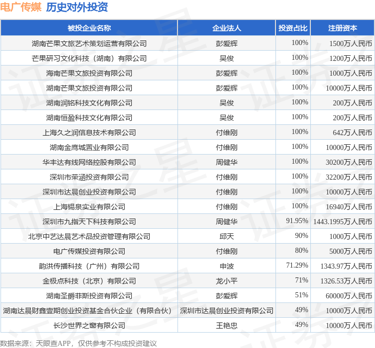 证券之星消息,根据天眼查APP显示,电广传媒(000917.SZ)新增一起对外投资事件,被投资公司为湖南芒果文旅艺术策划运营有限公司,法定代表人彭爱辉,投资占比为100%。该公司从事文化艺术业,注册资本为1500万人民币。目前,电广传媒共存在对外投资51项,投资占比前20的项目见下表: