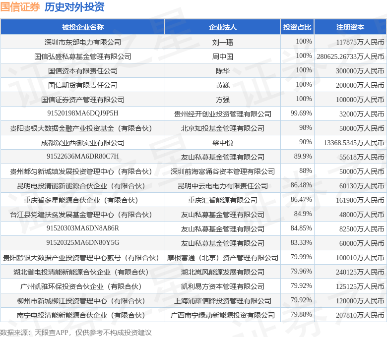 证券之星消息,根据天眼查APP显示,国信证券(002736.SZ)新增一起对外投资事件,被投资公司为晋能控股山西煤业股份有限公司,法定代表人李建光,投资占比为0.96%。该公司从事煤炭开采和洗选业,注册资本为167370万人民币。目前,国信证券共存在对外投资117项,投资占比前20的项目见下表: