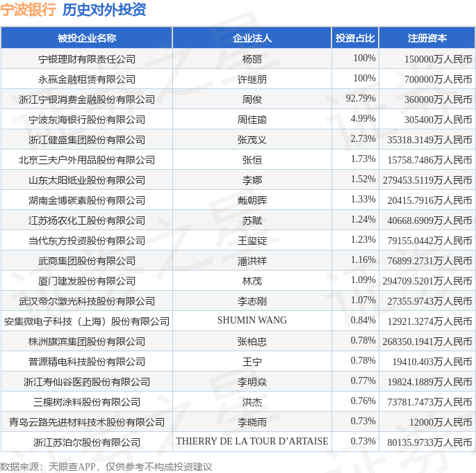 证券之星消息,根据天眼查APP显示,宁波银行(002142.SZ)新增一起对外投资事件,被投资公司为浙江托普云农科技股份有限公司,法定代表人陈渝阳,投资占比为0.32%。该公司从事仪器仪表制造业,注册资本为8528万人民币。目前,宁波银行共存在对外投资36项,投资占比前20的项目见下表: