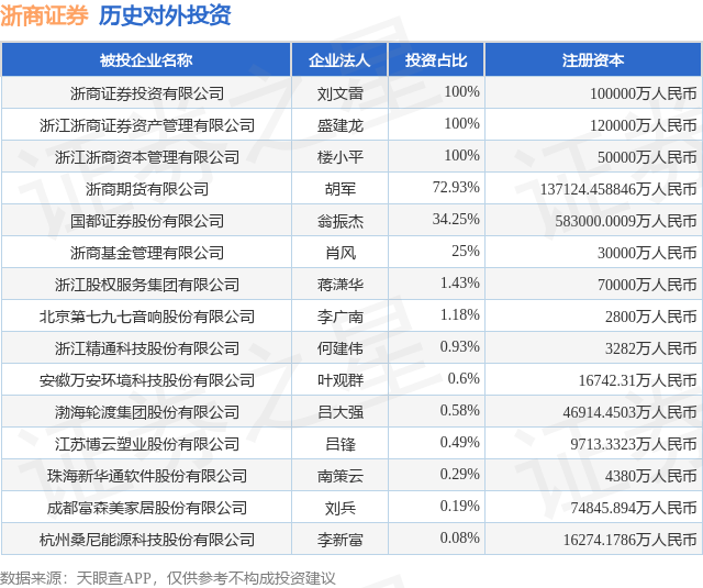通过天眼查大数据分析,浙商证券股份有限公司共对外投资了14家企业,参与招投标项目4498次;财产线索方面有商标信息48条,专利信息25条,著作权信息56条;此外企业还拥有行政许可65个。据2024年报数据,浙商证券商誉1984.53万元,同比未变化。长期股权投资53.87亿元,同比增4127.59%。