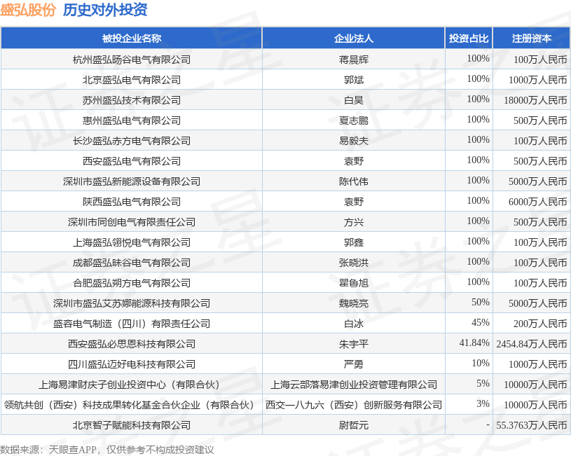 通过天眼查大数据分析,深圳市盛弘电气股份有限公司共对外投资了19家企业,参与招投标项目965次;财产线索方面有商标信息41条,专利信息310条,著作权信息58条;此外企业还拥有行政许可16个。据2024年报数据,盛弘股份长期股权投资100.0万元,同比未变化。