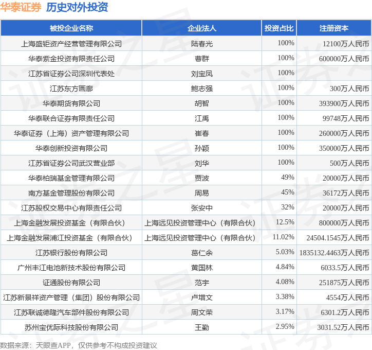 证券之星消息,根据天眼查APP显示,华泰证券(601688.SH)新增一起对外投资事件,被投资公司为华蓝集团股份公司,法定代表人雷翔,投资占比为2.02%。该公司从事商务服务业,注册资本为14700万人民币。目前,华泰证券共存在对外投资141项,投资占比前20的项目见下表: