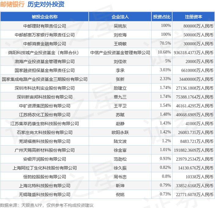 证券之星消息,根据天眼查APP显示,邮储银行(601658.SH)新增一起对外投资事件,被投资公司为汉威科技集团股份有限公司,法定代表人任红军,投资占比为0.48%。该公司从事仪器仪表制造业,注册资本为32744.5619万人民币。目前,邮储银行共存在对外投资51项,投资占比前20的项目见下表: