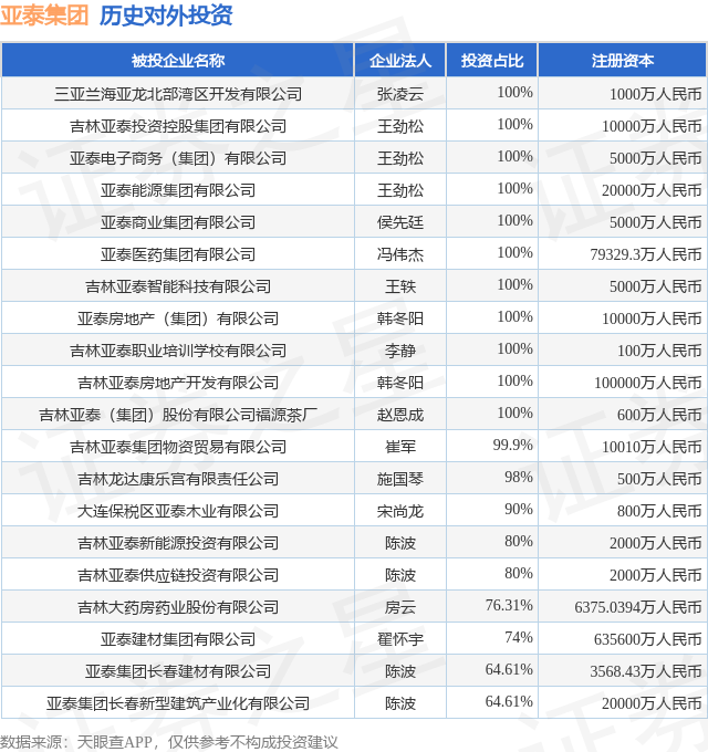 证券之星消息,根据天眼查APP显示,亚泰集团(600881.SH)新增一起对外投资事件,被投资公司为三亚兰海亚龙北部湾区开发有限公司,法定代表人张凌云,投资占比为100%。该公司从事建筑装饰、装修和其他建筑业,注册资本为1000万人民币。目前,亚泰集团共存在对外投资31项,投资占比前20的项目见下表: