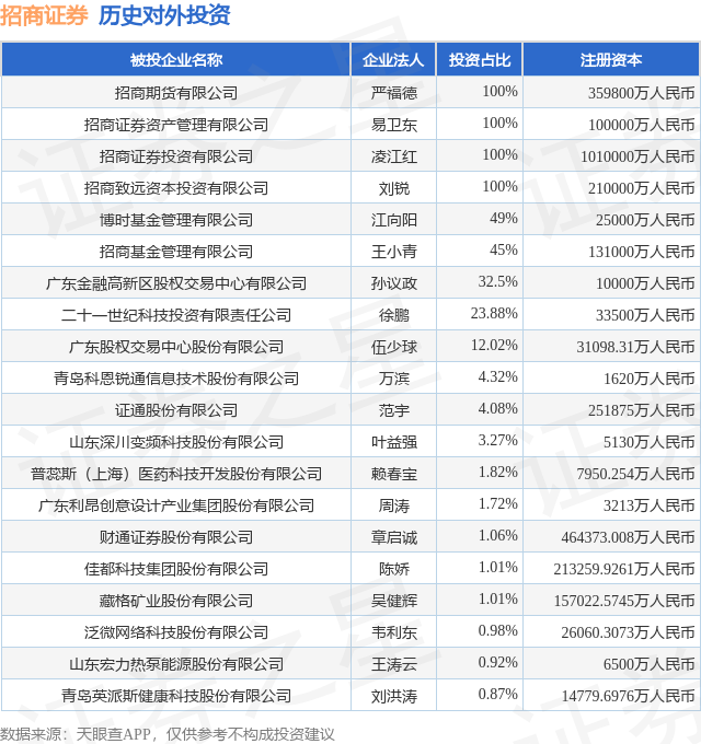 证券之星消息,根据天眼查APP显示,招商证券(600999.SH)新增一起对外投资事件,被投资公司为上海南方模式生物科技股份有限公司,法定代表人费俭,投资占比为0.48%。该公司从事研究和试验发展,注册资本为7796.3513万人民币。目前,招商证券共存在对外投资49项,投资占比前20的项目见下表: