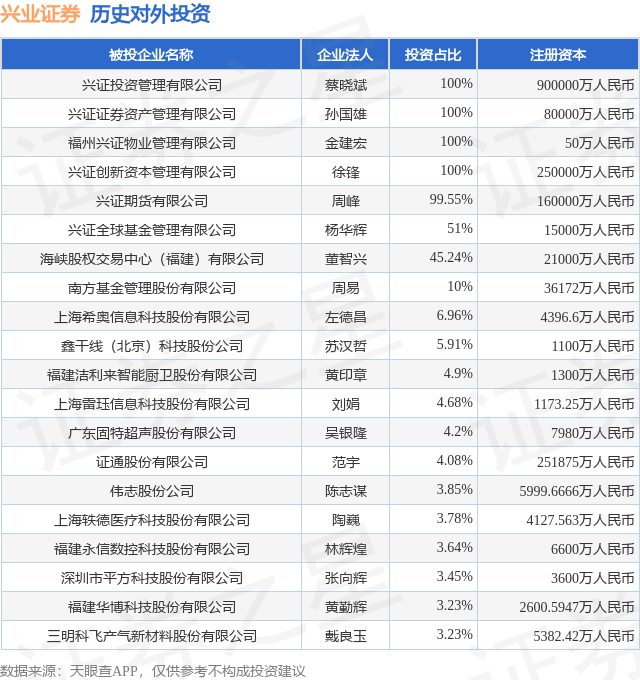 证券之星消息,根据天眼查APP显示,兴业证券(601377.SH)新增一起对外投资事件,被投资公司为欧克科技股份有限公司,法定代表人胡甫晟,投资占比为0.22%。该公司从事专用设备制造业,注册资本为9335.2万人民币。目前,兴业证券共存在对外投资79项,投资占比前20的项目见下表:
