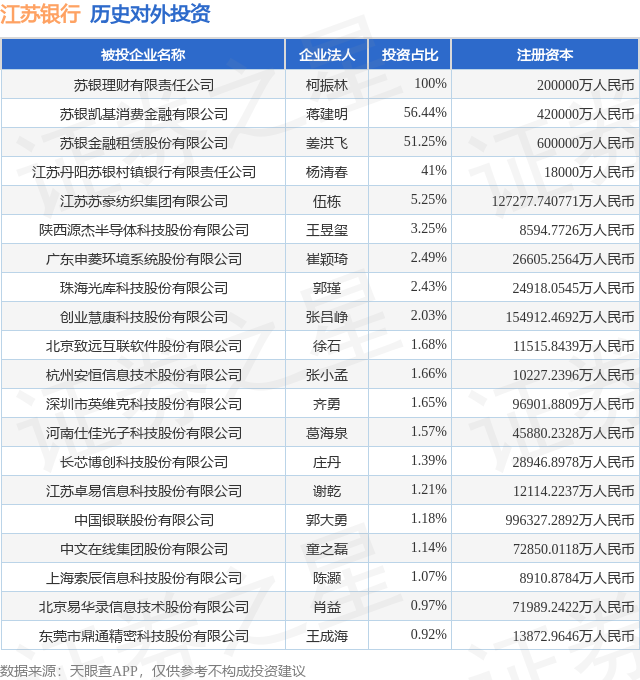 证券之星消息,根据天眼查APP显示,江苏银行(600919.SH)新增一起对外投资事件,被投资公司为陕西源杰半导体科技股份有限公司,法定代表人王昱玺,投资占比为3.25%。该公司从事计算机、通信和其他电子设备制造业,注册资本为8594.7726万人民币。目前,江苏银行共存在对外投资46项,投资占比前20的项目见下表: