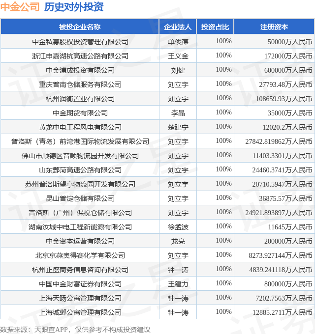 证券之星消息,根据天眼查APP显示,中金公司(601995.SH)新增一起对外投资事件,被投资公司为山东高速股份有限公司,法定代表人傅柏先,投资占比为0.23%。该公司从事道路运输业,注册资本为481116.5857万人民币。目前,中金公司共存在对外投资165项,投资占比前20的项目见下表: