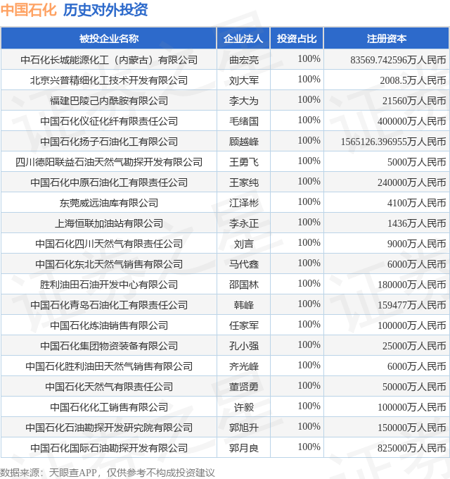 证券之星消息,根据天眼查APP显示,中国石化(600028.SH)新增一起对外投资事件,被投资公司为中石化长城能源化工(内蒙古)有限公司,法定代表人曲宏亮,投资占比为100%。该公司从事商务服务业,注册资本为83569.742596万人民币。目前,中国石化共存在对外投资194项,投资占比前20的项目见下表: