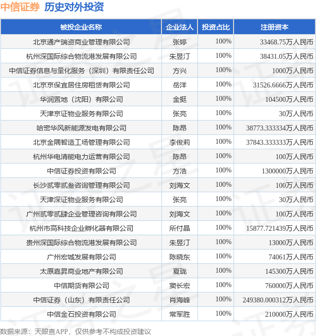 通过天眼查大数据分析,中信证券股份有限公司共对外投资了317家企业,参与招投标项目4773次;财产线索方面有商标信息133条,专利信息74条,著作权信息5863条;此外企业还拥有行政许可56个。据2024年报数据,中信证券商誉84.48亿元,同比增0.1%。长期股权投资96.08亿元,同比减0.44%。